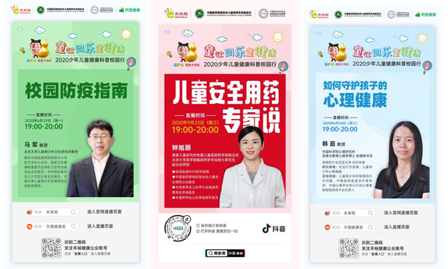 公开课邀请到中国科学院心理研究所发展与教育心理学博士、助理研究员韩茹,北京大学儿童青少年卫生研究所所长马军,首都保健营养美食学会会长、ISF健康学院院长王旭峰,首都儿科研究所附属儿童医院药学部副主任钟旭丽,ISF特聘高级营养讲师、首都保健营养美食学会任副秘书长李润庭分别就儿童心理健康、校园防疫、儿童营养健康、儿童用药健康以及儿童肠胃健康话题进行直播授课。公开课在阿里健康、抖音、一直播、淘宝直播平台进行直播,在线实时观看直播人数达40多万,通过未来网活动专区、官方微博等观看专题短视频流量达到200多万人次。▲儿童健康网络科普公开课